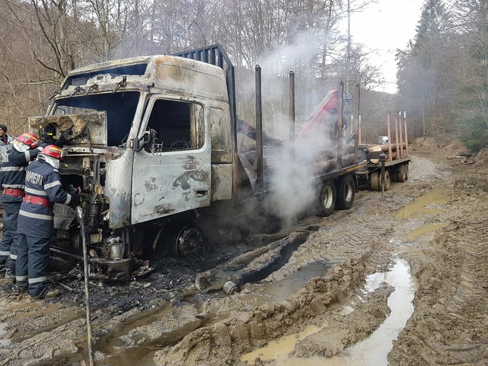 Kiégett egy farönköket szállító kamion szerda délután Arad megye dél-keleti részén, a Marosszalatna közelében lévő erdei úton.