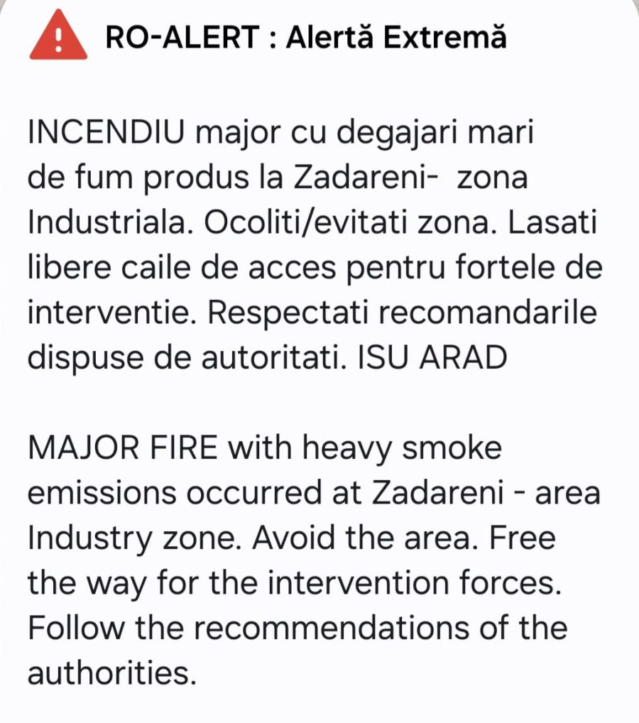 Az Arad megyei katasztrófavédelmi felügyelőség (ISU) tájékoztatása szerint az ipari övezet közelében található városrészekben és lakónegyedekben élőket RO-Alert telefonos üzenetben figyelmeztették a rendkívül szennyező anyagnak számító polisztirol égése miatt a levegőbe kerülő szennyező részecskékről.