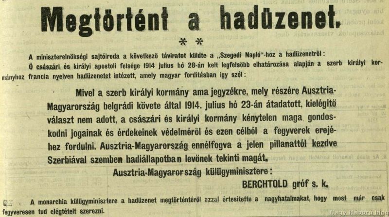 Június 28. az első világháború (a második világháború előtt egyszerűen csak a „a nagy háború”) kitörésének századik évfordulója. 1914-ben ugyanis ezen Ferenc Ferdinánd osztrák trónörökös egy boszniai hadgyakorlat megtekintésére utazott Szarajevóba. A hadgyakorlattal épp az volt a Monarchia célja, hogy demonstrálja erejét a forrongó Balkánon. Délelőtt merényletet kíséreltek meg a trónörökös ellen, amit ugyan ő maga sértetlenül túlélt, ám kíséretének egyik tagja – egy katonatiszt – megsebesült. Nem sokkal később Ferenc Ferdinánd útra kelt, hogy meglátogassa a kórházban a katonatisztet, ám útközben Gavrilo Princip, a Fekete Kéz nevű titkos szerb szervezet tagja pisztollyal halálosan megsebesítette őt és feleségét. Ezt követően Bécsben és Budapesten egyaránt fellángoltak a szerbellenes indulatok, Ferenc József pedig II. Vilmos német császárhoz fordult, levelében utalva arra, hogy Szerbiával az ellentétek soha nem simulhatnak el. Helmuth Johannes Ludwig von Moltke német vezérkari főnök kifejtette: az erőviszonyok most a legkedvezőbbek, 1914 után csak romlani fognak, mert Oroszország vasúti hálózatot épít ki, s ezzel mobilisabbá teszi hadseregét. A válasz tehát ez volt: most, vagy soha!