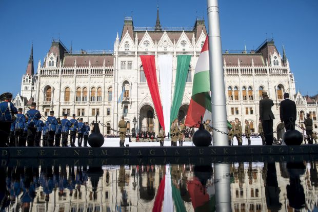 A lobogót Áder János magyar köztársasági elnök jelenlétében, a Himnusz hangjaira a Magyar Honvédség díszegysége vonta fel.