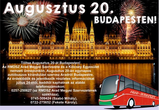 Az RMDSZ Arad megyei szervezete és az aradi Kölcsey Egyesület autóbuszos kirándulást szervez nemzeti ünnepünkre, augusztus 20-ra Budapestre. Információk július 24-től, keddtől kérhetők az RMDSZ Episcopiei (Batthyány) utca 32. szám alatti székházában, vagy a 0257/250–627-es, a 0745/309–424-es és a 0722/275–652-es telefonszámokon.