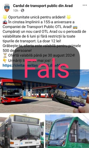 A Facebookon terjedő hirdetmény szerint a CTP a vállalat 155. évfordulója alkalmából bocsátotta ki az „Aradi tömegközlekedési kártyát” („Cardul de transport public din Arad”), amelyet az „első szerencsés 500 vásárló” mindössze 12 lejért válthat meg, és fél évig használhatja. Az akció augusztus 30-ig érvényes – teszik hozzá. Ha valaki a megadott linkre kattint, akkor már csak 11,75 lej az ár, továbbá egy online kérdőív kitöltésére kérik, amelyben a személyes és bankkártya adatokat kell megadni.