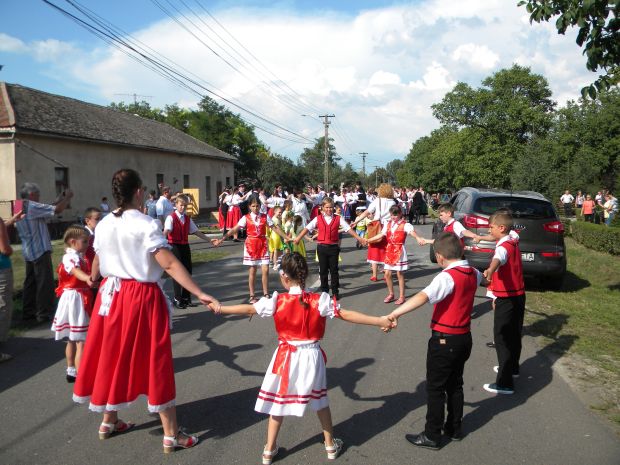 A vasárnap délutáni ünnepi istentisztelet után zenés kísérettel vonultak fel a néptáncegyüttesek a falu központjában.