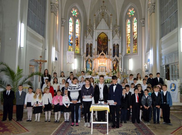 Zsúfolásig megtelt a vasárnap délelőtti szentmisén a pécskai római katolikus templom, az első sorokban a 2-es számú Általános Iskola több mint ötven magyar tagozatos diákja foglalt helyet, a legkisebbektől a végzősökig, mellettük az őket felkészítő tanítónőkkel és Bella Ibolya hitoktatóval.