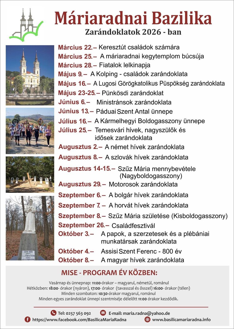 Az idei zarándoklatok sora március 22-én már megkezdődött, és 25-én, Gyümölcsoltó Boldogasszony napján, a radnai templom búcsúünnepén folytatódik.