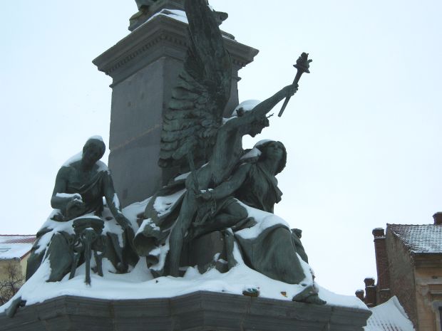 Az allegorikus szoborcsoportot 1890. október 6-án avatták fel Aradon, de a hatalomváltás után a román kormányzat 1925-ben lebonttatta; 1999-ben szabadították ki az aradi várból, míg végül ötévi restaurálás után sikerült 2004-ben – nem eredeti helyén, hanem – a Tűzoltók terén (volt Attila téren) újraállítani. 2014-ben a helyi és az országos RMDSZ-vezetőség közbenjárására, Kelemen Hunor kulturális miniszteri mandátuma idején nyilvánították a kivételes szobrot és környékét, a Román–magyar megbékélés parkját országos jelentőségű műemlékké.
