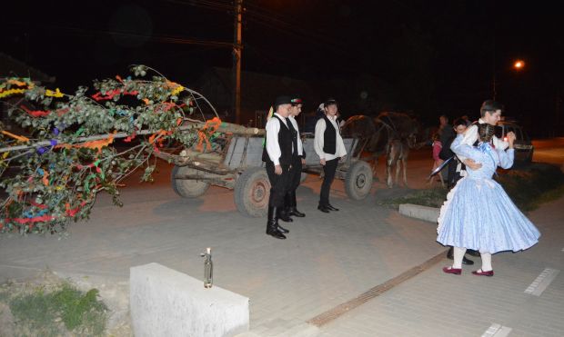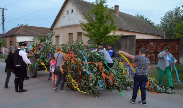 A rendőrautóval felvezett kocsi ezután végigment Pécskán, hogy a város Arad felőli bejáratánál lakó Szép családhoz érkezzen. Az úton sokan kíváncsian figyelték a nem mindennapi eseményt, többen lefotózták a májusfát szállító szekeret a népviseletbe öltözött fiatalokkal. Szép Noémi a kapuban várta a legényeket, közösen énekeltek és táncra is perdültek, majd helyére került a májusfa is, a kapu mellé.