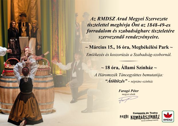 Az 1848–1849-es magyar forradalom és szabadságharc kitörésének 174. évfordulója alkalmából az alábbi programokat szervezi az RMDSZ Arad megyei szervezete.