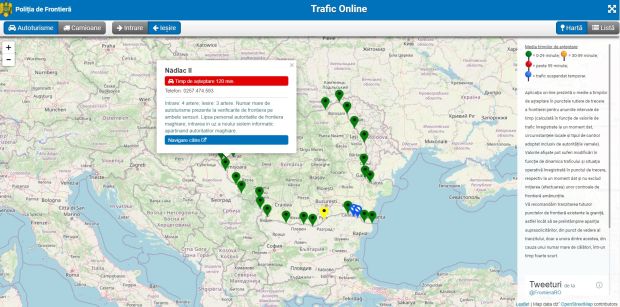 A személygépkocsik és kamionos esetében egyaránt két óra a várakozási idő. a forgalmat három kilépő sávon bonyolítják le. A tájékoztatás szerint a román hatóságok kérték a magyar felet, hogy növeljék az állományt, és nyissanak meg több terminált.