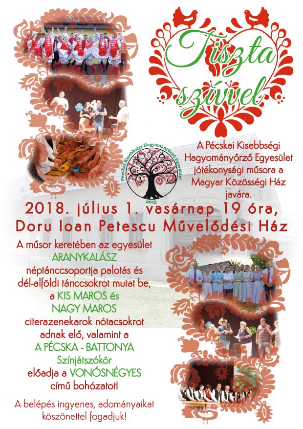 Tiszta szívvel címmel mutat be vasárnap 19 órai kezdettel jótékonysági műsort a Pécskai Kisebbségi Hagyományőrző Egyesület a helyi művelődési házban. A belépés ingyenes, de a helyszínen mindenki a saját belátása szerint adakozhat a Magyar Közösségi Ház javára.