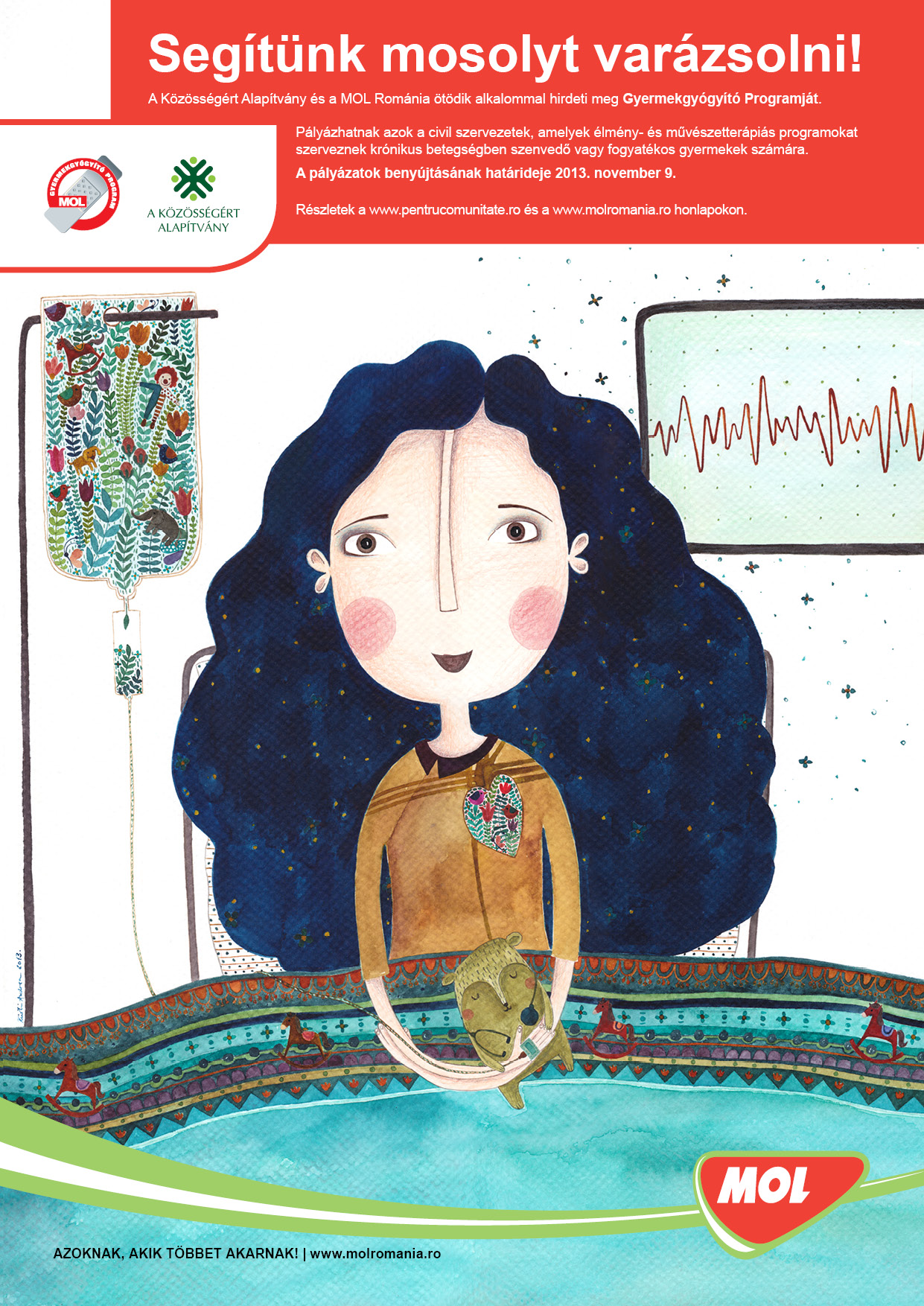 A MOL Románia és A Közösségért Alapítvány ötödik alkalommal hirdette meg a MOL Gyermekgyógyító Programot, melynek révén 300 000 lej összértékű támogatást nyerhetnek olyan civil szervezetek, amelyek krónikus betegségekben szenvedő, fogyatékkal élő, vagy hosszas kórházi kezelés után lábadozó gyermekek élményterápiás vagy művészeti terápiás kezelésével foglalkoznak. A program célját s folytonosságát tekintve egyedinek számít Romániában. „A MOL Gyermekgyógyító Program eddig 6600 gyermek esetében jelentett segítséget, a támogatások összértéke pedig mostanáig közel 1,2 millió lej. Úgy hisszük, hogy a vállalkozás és a közösség fejlesztése csakis együtt történhet. Ez a program sok fiatal és sok család életébe hozott kedvező változást. Határozott álláspontunk a további támogatás és fejlesztés, ezért is alapítottuk a MOL Gyermekgyógyító Díjat, amellyel a legsikeresebben megvalósított projektet jutalmazzuk”, nyilatkozta Daradics Kinga, a MOL Románia ügyvezető igazgatója.