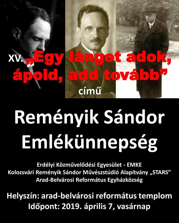 Az Erdélyi Magyar Közművelődési Egyesület, a Kolozsvári Reményik Sándor Művészstúdió Alapítvány és az Arad-belvárosi Református Egyházközség április 7-én, vasárnap szervezi meg a XV. Reményik Sándor-emlékünnepséget „Egy lángot adok, ápold, add tovább” címmel az aradi belvárosi református templomban.