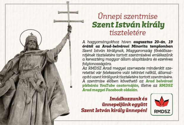 Augusztus 20-án, csütörtökön 19 órától az Arad-belvárosi Minorita templomban az államalapító Szent István király tiszteletére szentmisét tartanak a keresztény magyar állam alapításának emlékére, és az ezeréves folytonosság tiszteletére.