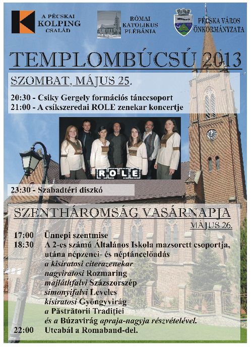 A pécskai Kolping Család és a Római Katolikus Plébánia a Polgármesteri Hivatal és a Helyi Tanács támogatávásal idén is ünnepélyes keretek között tartja meg a Szentháromság templom búcsúját. Az eseményre, ami egyben a helyi magyarság legnagyobb ünnepe is, május 25-én és 26-án, szombaton és vasárnap kerül sor a piactéren.