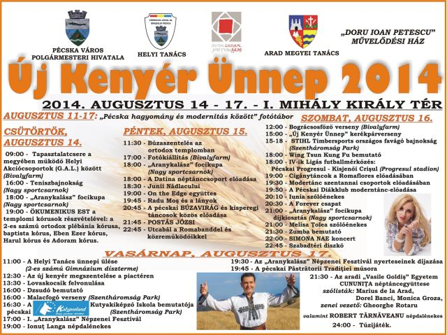 A Pécskai Polgármesteri Hivatal, a Pécskai Helyi Tanács és a Művelődési Ház, az Arad Megyei Tanács és a Megyei Kulturális Központ támogatásával idén is megrendezi az Új Kenyér Ünnepét augusztus 14. és 17. között a római katolikus piactéren. Íme, a program: