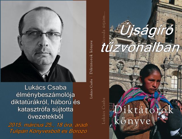 Március 25-én, szerdán 18 órától Lukács Csaba, a Magyar Nemzet főmunkatársa tart élménybeszámolót diktatúrákról, háború és katasztrófa sújtotta övezetekből az aradi Tulipán Könyvesbolt és Borozóban, s egyúttal bemutatja a bolíviai, burmai, észak-koreai, kubai útjait dokumentáló, illetve a Ceauşescu Romániájáról is szóló Diktátorok könyve című kötetét.