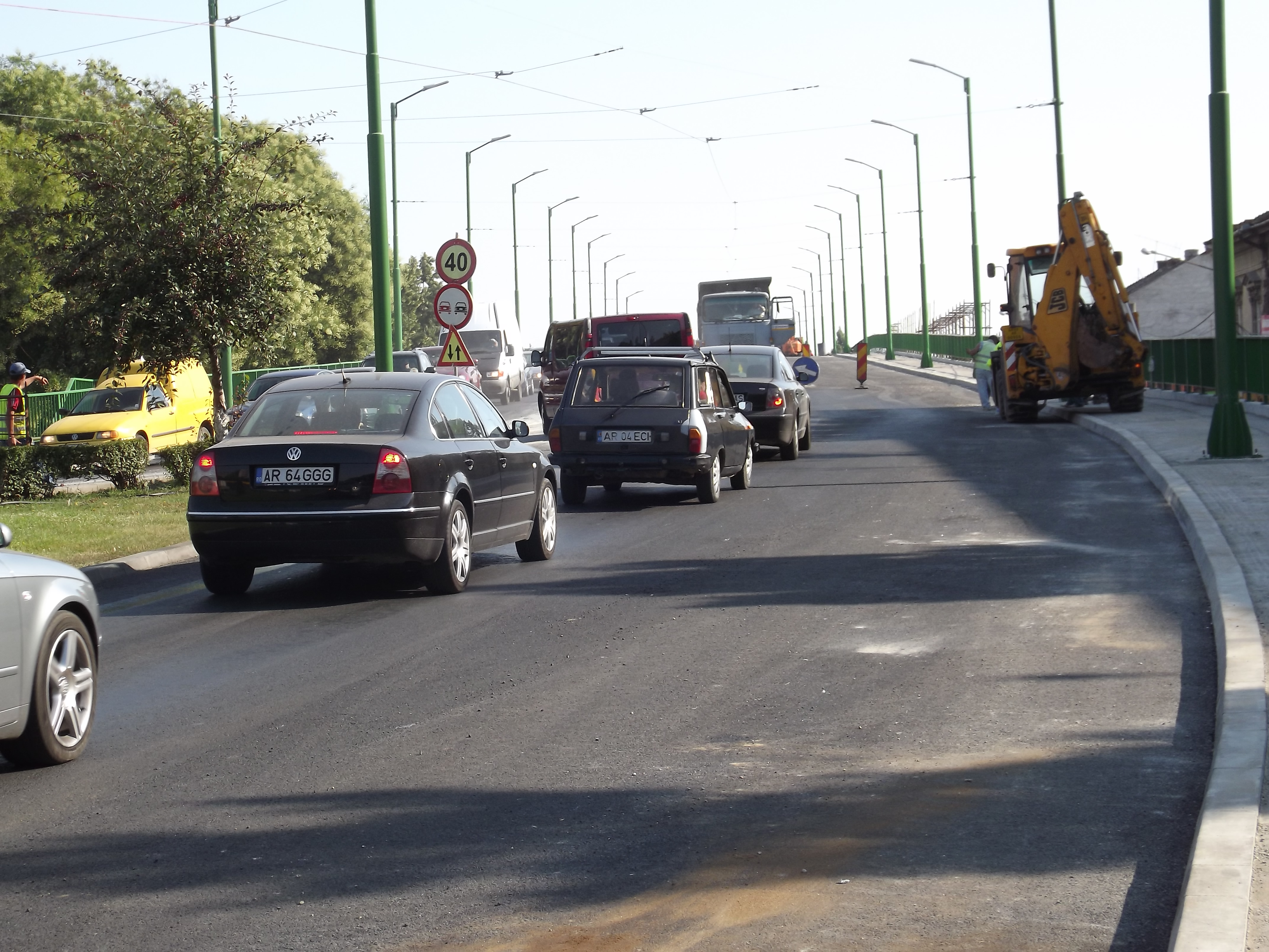 Az egyetlen "furcsaság" (= pofátlanság az aradiakkal szemben) a felújítással kapcsolatban: a Tehnodomus tavaly augusztusban kezdte el a munkálatokat, és most június 10-re, vagyis durván 10 hónap alatt fejezte be a felüljáró fél oldalát, ekkor terelték át a forgalmat. A másik fél oldallal pedig bő másfél hónap alatt végeztek. Egyébként a felújítás eddigi egyetlen, látható hiányossága, hogy a felüljárón nincs esővízelevezető-csatorna, a csapadék majd akadálytalanul zúdul le. Mosócz felől az első csatornarács az Astra előtt található, a belvárosi oldalon pedig a park szélén. De ez el van dugulva.