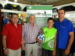 Pataky Lehel Zsolt, az Aradi Hírek felelős szerkesztője, Juhász Béla, a Bel-Ami tulajdonosa, Németh Balázs és édesapja, AttilaÁtvette a focilabdát a tippverseny nyertese