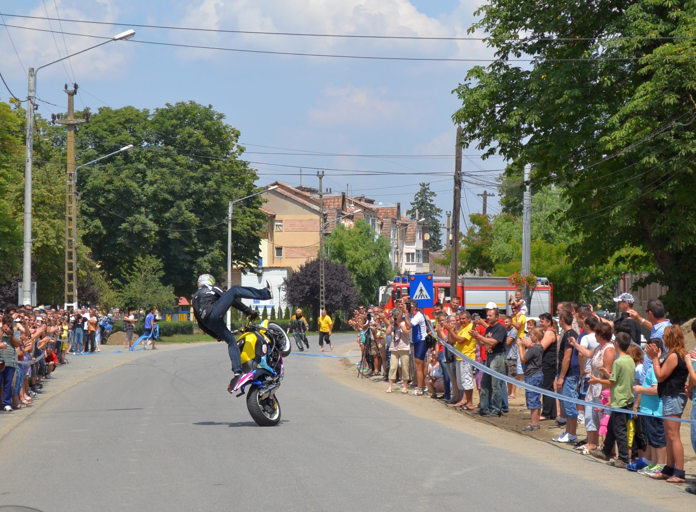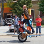 Visszaérkezésükkor a Pécska központjában lévő szökőkút környéke parkolóvá alakult át, az utca két oldala pedig nézőtérre, mivel 14 óra után a kecskeméti Gergely Sanyi tartott motoros kaszkadőrbemutatót a népes közönségnek. Bár a Kiserdőben, a MotoRock Találkozó helyszínén idén kevesebben gyűltek össze, a pécskaiakat sikerült a korábbi kiadásokhoz jobban bevonni: a bemutató nézőinek körülbelül fele nem sorolható a rendezvény célcsoportjába, mégis ámultan tapsolta meg az egykeréken, kéz nélkül és egyéb látványos módon végrehajtott kaszkadőrelemeket.