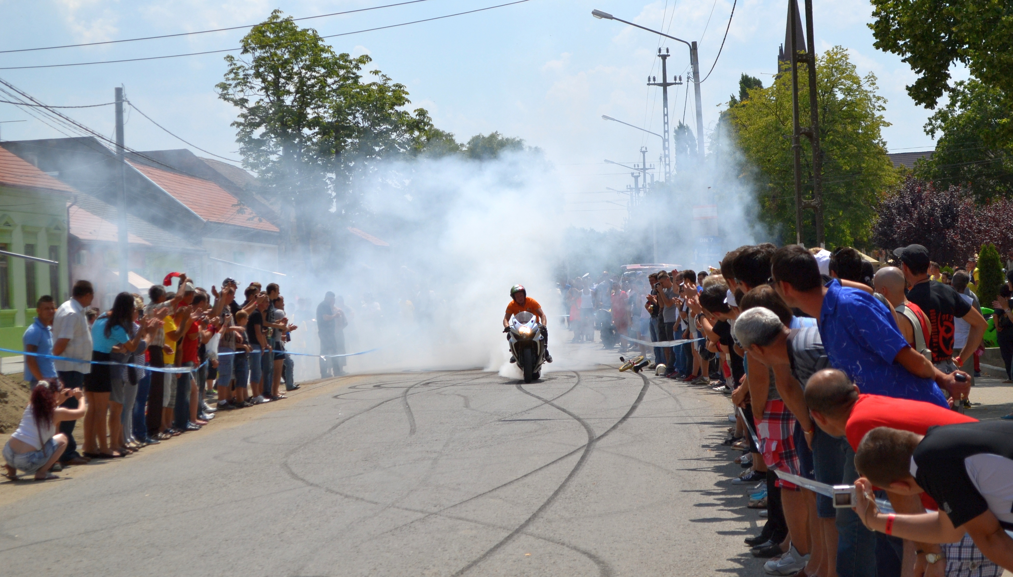 A félórás műsor alatt belepte a környéket a füst és az égett gumiabroncs szaga, a végén a magyar fiatalember motorján állva köszönte meg a fogadtatást.