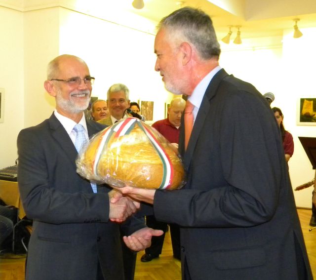 Páva Zsolt pécsi polgármester (jobbról) átnyújtja Bognár Levente aradi alpolgármesternek a reggel Pécsett sütött Magyarok kenyerét