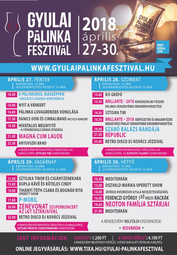 A program külön belépődíj köteles (3990 Ft). Regisztráció előzetesen az info@gyulaipalinkafesztival.hu e-mail címen lehetséges.