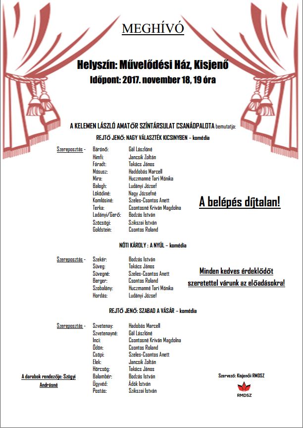 November 18-án, szombaton 19 órától a kisjenői RMDSZ szervezésében a csanádpalotai Kelemen László Amatőr Színtársulat lép fel a helyi kultúrotthonban. A meghívottak három vígjátékot adnak elő, sorrendben: sorrendben Rejtő Jenő: Nagy választék kicsinyben, Nóti Károly: A nyúl és Rejtő Jenő: Szabad a vásár című komédiákat.