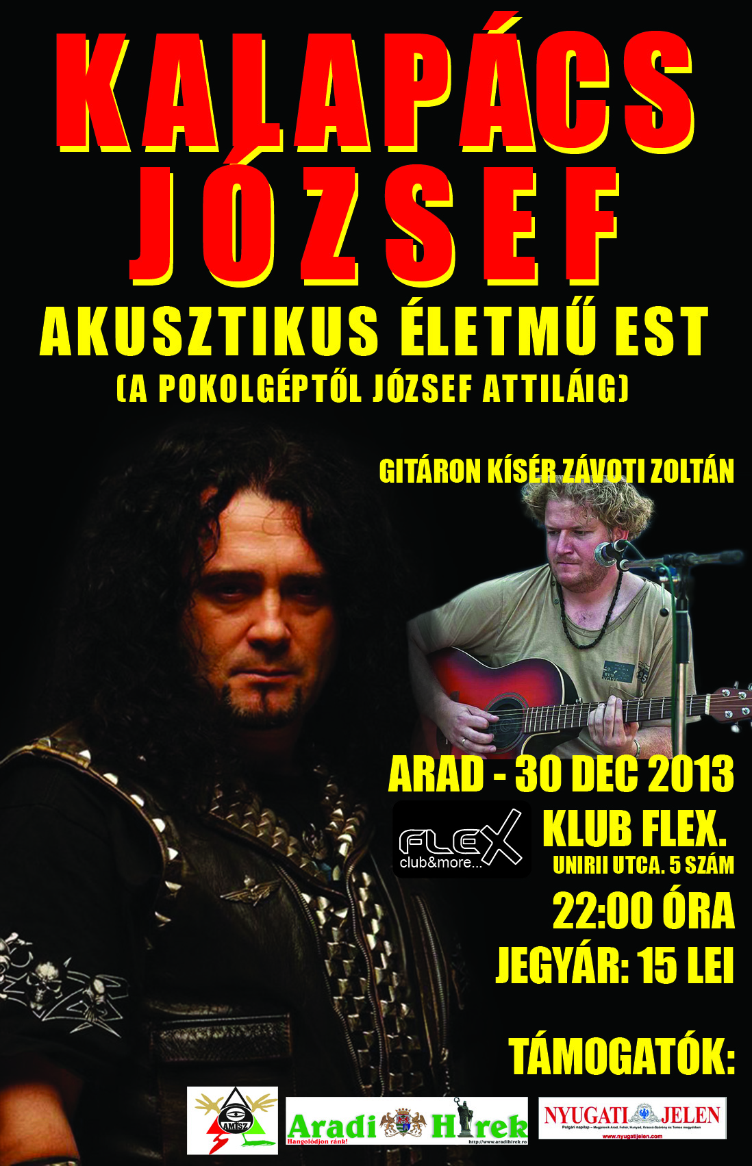 Kalapács József, a Pokolgép és az Omen együttesek volt, a Kalapács zenekar jelenlegi énekese és frontembere december 30-án az aradi Flex klubban tart akusztikus életműkoncertet. Felhangzanak az egykori Pokolgép-daloktól kezdve megzenésített József Attila-verseken át ismert rockopera-betétek. Gitáron kísér Závoti Zoltán. A koncert kezdési időpontja este tíz óra, jegyek 15 lejért vásárolhatók a helyszínen. Kalapács József legutóbb a tavalyi pécskai motoros-találkozón koncertezett Arad megyében, az akkor készült interjú meghallgatható itt.Kalapács-életműest Aradon