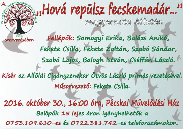 A Pécskai Kisebbségi Hagyományőrző Egyesület Hová repülsz, fecskemadár… címmel magyarnóta-délutánt szervez október 30-án, vasárnap 16 órátál a pécskai művelődési házban. Szeretettel várják a magyarnóta-kedvelőket, hogy közösen éltessék nemzetünk egyik legféltettebb kincsét, a magyarnótát és hű kísérőjét, a cigánymuzsikát! Jegyek elővételben a 0753/109–610-es vagy a 0722/381–742-es telefonszámon igényelhetők 15 lejes áron.