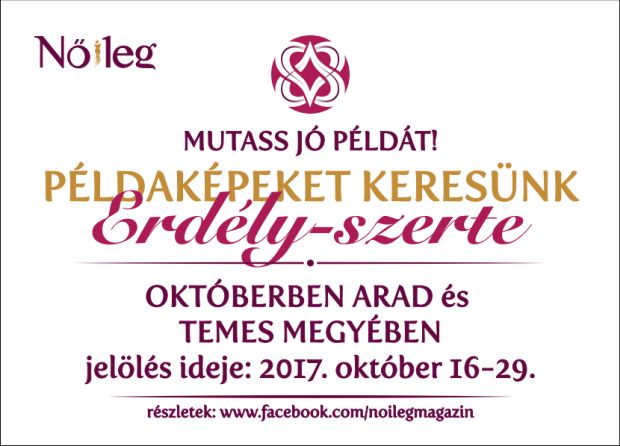 Hetedik ciklusát zárta a Nőileg magazin Mutass jó példát! programja, amelyre októberben Arad és Temes megyéből lehetett példaképeket jelölni. A két megyéből összesen 36 jelölőlapot küldtek be, 32 jelöltre. Közülük kerül ki majd Arad és Temes megye példaképe, valamint a második és a harmadik helyezett is – olvasható a lap közleményében. A győztessel a január–februári összevont lapszámba készül címlapinterjú.