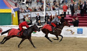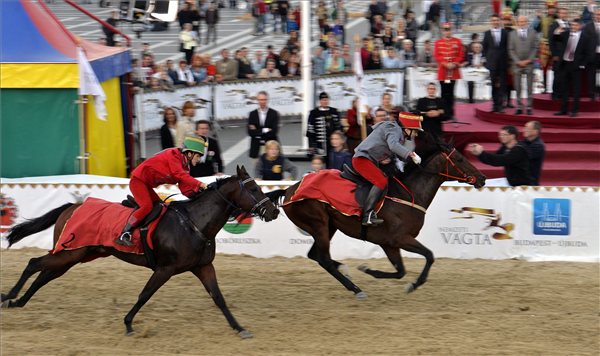 A győztes Németh János (j), Baja lovasa a célban My Boy Mennydörgés nevű lován a hatodik Nemzeti Vágta döntőjében a budapesti Hősök terén. Fotó: MTI