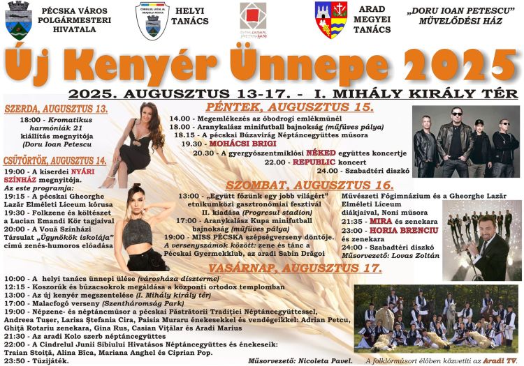 Az újkenyér hagyományos ökumenikus megszentelését augusztus 17-én, vasárnap 13 órától tartják a főtéren, előtte, 10 órától a városi képviselőtestület ünnepi ülésére kerül sor.