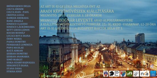 Huszonhárom aradi képzőművész alkotásaiból nyílik kiállítás február 3-án, kedden Budapesten a XI. kerületi Art IX-XI Galériában. Többek között Kett Groza János, Ódry Mária, Siska-Szabó Hajnalka, Simó Margit és Kocsis Rudolf munkáiból rendezik meg a tárlatot, amely február 15-ig látogatható a magyar fővárosban. A kiállítást Bognár Levente aradi alpolgármester nyitja meg.