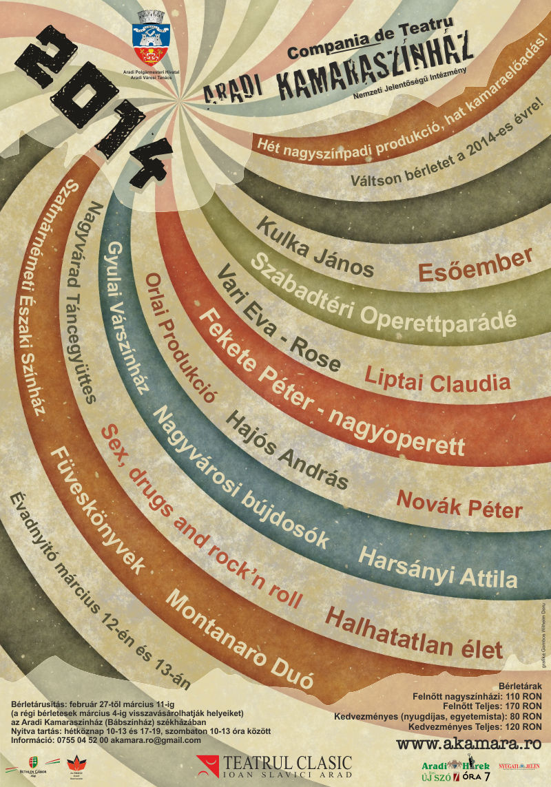Elkezdődött a bérletárusítás az Aradi Kamaraszínházban. Összesen tizenhárom (hét nagytermi és hat kamaraszínházi) produkciót kínál a nézőknek 2014-ben az Aradi Kamaraszínház. A színház egy-egy előadást többször tűz műsorra, így azok a nézők, akiknek nem volt lehetőségük arra, hogy bérletet váltsanak az előadásokra, idén megtehetik.