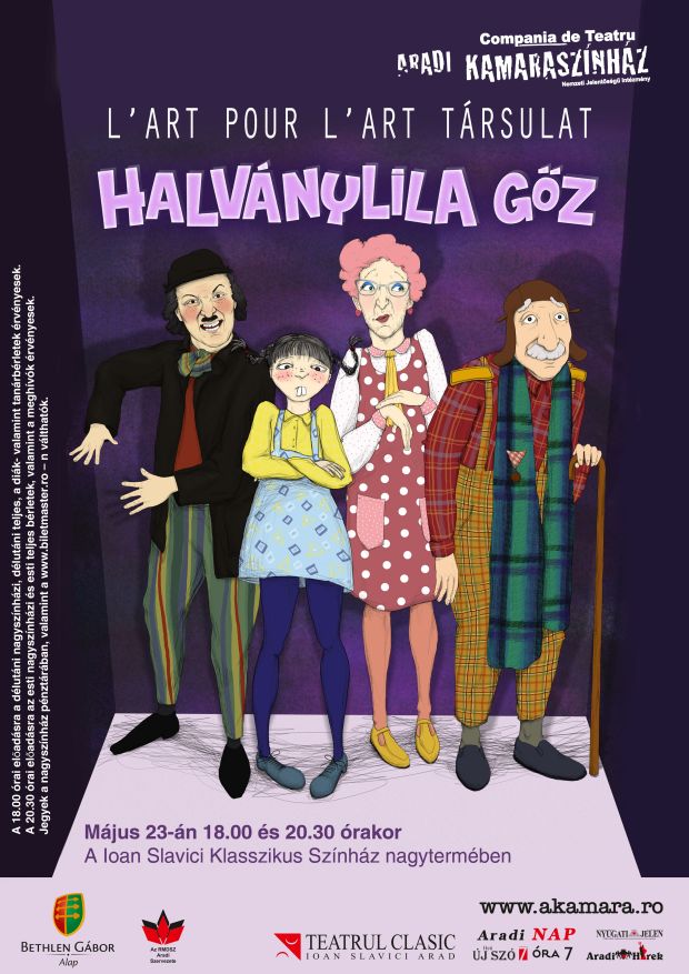 Az Aradi Kamaraszínház bérletes előadásaként a L'art pour l'art Társulat legújabb, sorrendben 17. önálló színházi estjét tekinthetik meg a nézők május 23-án, kedden 18 és 20.30 órától a Ioan Slavici Klasszikus Színház nagyszínpadán. Sokáig halványlila gőzük sem volt, hogy milyen címet adjanak a legújabb őrületes, fergeteges műsoruknak. Aztán a probléma megoldotta saját magát, így lett az új est címe: Halványlila gőz – olvasható a közleményben.