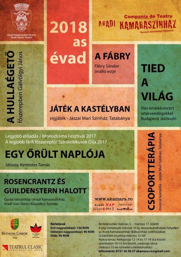 Bérletárusítás: március 5. és 17. között az Aradi Kamaraszínház székhelyén, a Bábszínház épületében. Március 15-én szünetel a bérletárusítás. Nyitva tartás: hétköznap 12–14 és 17–19, szombaton 10–13 óra között, vasárnap zárva. A régi bérletesek március 5. és 10. között visszavásárolhatják régi helyeiket.