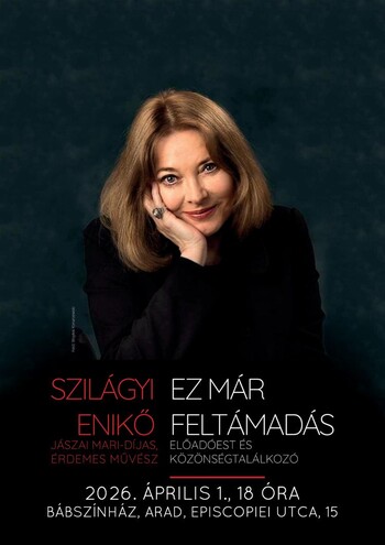 Április 1-én, szerdán 18 órakor különleges elcsendesedésre invitálja a nézőket az Aradi Kamaraszínház. Ez már feltámadás című előadóestjével Szilágyi Enikő Jászai Mari-díjas, érdemes művész lép színpadra a bábszínház termében.