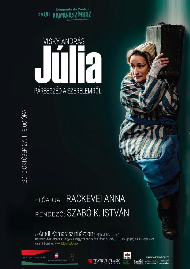 Október 27-én, vasárnap 18 órakor a Debreceni Csokonai Színház és a Borostyán Produkció előadását, Visky András: Júlia – Párbeszéd a szerelemről című monodrámáját láthatják az Aradi Kamaraszínház nézői Ráckevei Anna előadásában.