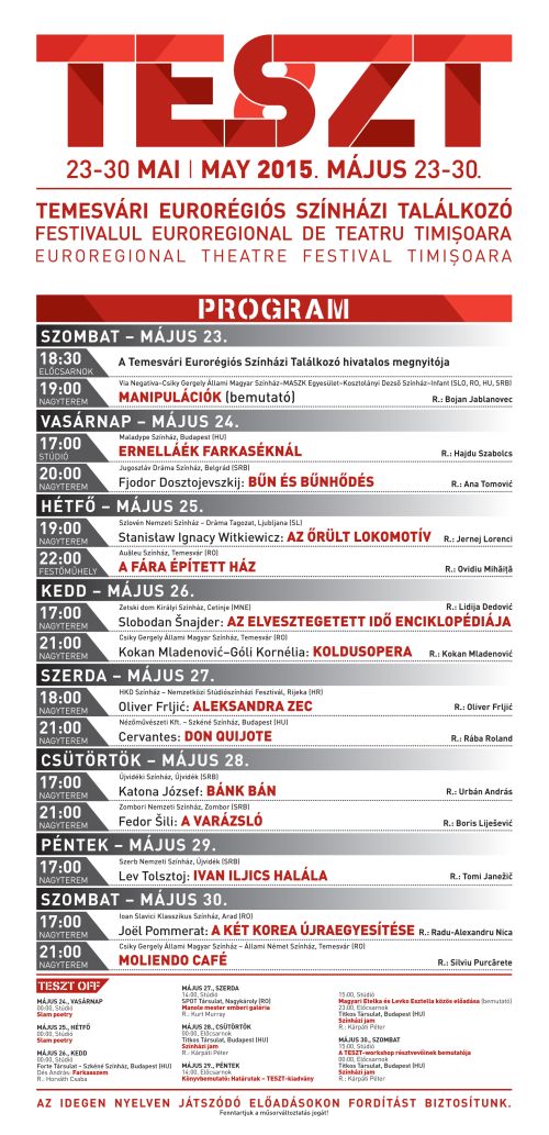 A program további részében a különböző együttműködések során létrejött előadások a hét folyamán olyan produkciókat fognak közre, mint az Oliver Frjlić rendezte Aleksandra Zec, amely 2014-ben megkapta a legjobb előadásért járó díjat a BITEF nemzetközi színházi fesztiválon, Urbán András Bánk bánja, amely egyszerre fontos és kényes kérdéseket feszeget nem kis mértékben osztva meg ezáltal a közönséget, s melyet társadalmilag hasznos színházi előadásként határoznak meg az alkotók. De a találkozó programjában helyet kapott a 2013-as TESZT-en bemutatott legendás Sirály rendezőjének Tomi Janežičnek legújabb előadása is, amelyben rendhagyó módon, közös olvasásra invitálja a nézőket, hogy Tolsztoj Ivan Iljics halála című szövege kapcsán együtt gondolkodjunk, olvassunk, közösen fogalmazzuk meg saját kérdéseinket. A régi és új, klasszikus és kortárs szövegekre épülő előadások gazdag kínálatot nyújtanak a nézőknek hat ország színházi kultúrájából merítve. A belgrádi, ljubjanai, cetinjei társulatok, illetve a visszatérő újvidéki színházak mellett látható lesz a Nézőművészeti kft. legújabb előadása is. A programban olyan rendezők nevei tűnnek fel, akik valamilyen módon kötődnek a temesvári színházhoz, dolgoztak a társulattal, vagy már részt vettek a fesztiválon, így láható lesz Hajdu Szabolcs, Boris Liješević, Radu-Alexandru Nica egy-egy előadása, illetve Kokan Mladenović-nak a temesvári színházban bemutatott Koldusopera című produkciója is. Az előadások gazdag képet nyújtanak arról, hogy a régió színházi alkotói hogyan látják, miről és milyen módon érdemes a színházban beszélni.