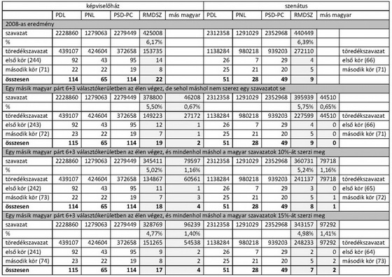 2. ha a másik magyar pártnak csak a szavazatokban mért támogatottságát és az ahhoz társítható mandátumok számát nézzük, akkor felbecsülhetjük, hogy mennyivel gyengítené a magyar képviseletet, ha elvinne szavazatokat az RMDSZ-től, ám mégse jutna be (ehhez elég, ha megfordítjuk az RMDSZ-szavazatok szétosztását, és az RMDSZ-t „tartjuk” az első helyen egy vagy két szavazatnyi előnnyel). Látható, hogy ha a másik magyar párt nem érte volna el az alternatív küszöböt, de nagyságrendileg ugyanannyi szavazatot vett volna el az RMDSZ-től,