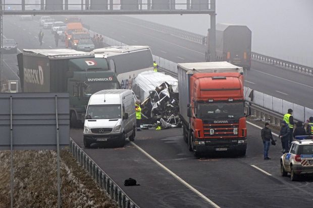A hírtelevízió képeket is közölt a baleset helyszínéről. Ezeken az látszik, hogy a sűrű ködben legalább egy kamion, egy román rendszámú autóbusz és legalább két kisbusz ütközött össze.