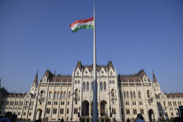 Katonai tiszteletadással, Kövér László, a magyar Országgyűlés elnöke jelenlétében felvonták a nemzeti lobogót az 1956-os forradalom és szabadságharc 63. évfordulóján szerda reggel a Parlament előtti Kossuth Lajos téren.