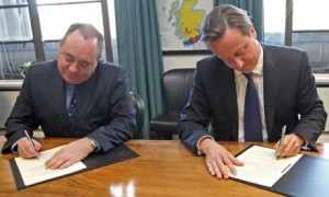 Aláírta a skót és a brit kormányfő ma Edinburghban azt a megállapodást, amely a Skócia függetlenné válásáról 2014-re kiírt népszavazás szabályait rögzíti. A dokumentum aláírásával hivatalosan is megkezdődött a függetlenségpárti skót kormány kampánya, illetve a skót elszakadást ellenző brit kormány ellenkampánya. A referendumot szabályozó okmányt Alex Salmond, a skót tartományi kormány vezetője és David Cameron brit miniszterelnök írta alá a skóciai fővárosban.