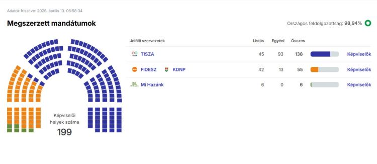 A Magyar Péter által vezetett alakulat 199 fős parlamentben a jelek szerint 138 helyet szerzett meg, a 2010 óta kormányzó, nemzeti érdekeket képviselő Fidesz-KDNP pártszövetség jelöltjei pedig 55 mandátumot szereztek.