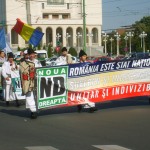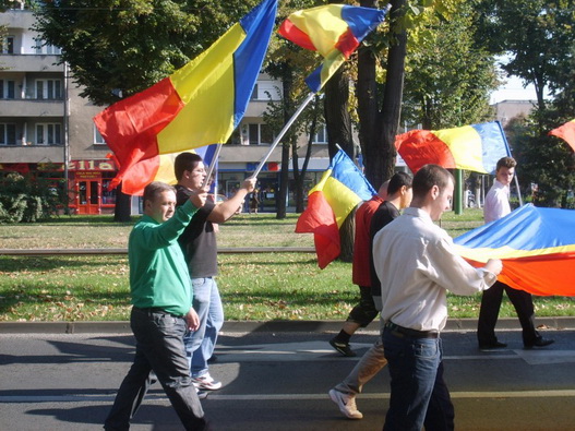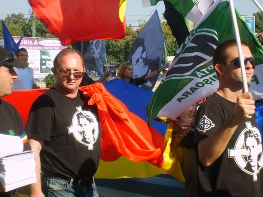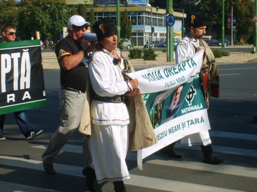 „Ne emlékezzetek nálunk háborús bűnösökre”, Hargita és Kovászna román föld”, Besszarábia román föld”, Románia egységes nemzetállam”, „Románia román föld”, „Csak a román nyelv a hivatalos”, Avram Iancu az igazi román” és „Aki román csatlakozzon hozzánk”, skandálták a ma Aradon 15 órakor kezdődött magyarellenes tüntetésen a szélsőséges román nacionalista párt, az Új Jobb (Noua Dreaptă – ND) aktivistái. Ám hiába vonultak végig zászlókkal, transzparensekkel az ortodox katedrálistól a színházig, egyetlen román sem csatlakozott hozzájuk, így aztán ugyanaz a harminc ember fejezte be a megmozdulást, aki összegyűlt a párt Hegyalja téri székházában. Az engedélyezett tüntetés fő célja az volt, hogy tiltakozzanak a 13 vértanúra való megemlékezés ellen. A ND aradi vezetője a vonulás ideje alatt elmondta, nekik általában semmi bajuk a magyarokkal, csak az irredenta vezetőikkel, akik szét akarják szakítani az országot és „románokat gyilkoló háborús bűnösökre” emlékeznek. A menetet a helyi rendőrség és a csendőrség biztosította, atrocitásokra nem került sor, igazából csak a gépkocsivezetők szitkozódtak a kormány mögött, amiért bő félórára lezárták a Forradalom útja egyik oldalát.
