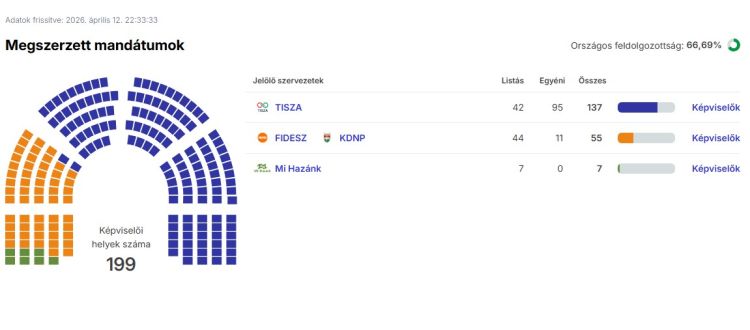 A Nemzeti Választási Iroda (NVI) szerint a szavazatok 66,69%-os feldolgozottsága alapján a 199 mandátumból 137-et az ellenzéki, Magyar Péter vezette Tisza Párt szerezhet meg, ami több mint kétharmados többséget jelent.