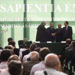 Dávid László rektor, Orbán Viktor miniszterelnök, Kató Béla, a Sapientia Alapítvány elnöke és János-Szatmári Szabolcs, a Partium Keresztény Egyetem rektora) kezet fognak a Sapientia – EMTE ünnepségén