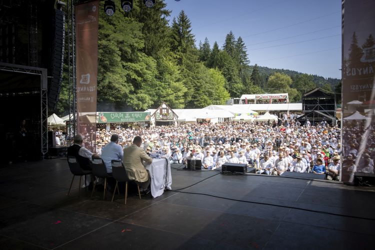 Orbán Viktor előadást tart a 33. Tusványoson. Mellette Németh Zsolt, az Országgyűlés külügyi bizottságának fideszes elnöke és Tőkés László, az Erdélyi Magyar Nemzeti Tanács elnöke (takarásban) | Fotó: MTI/Miniszterelnöki Sajtóiroda/Fischer Zoltán