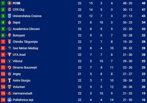 - További eredmények: Sepsi OSK–Poli Iași 3–3, Astra Giurgiu–FC Argeş 0–2, U. Craiova–Dinamo 1–0; FRISSÍTÉS: Gaz Metan–Chindia 1–0, FCSB–Academica Clinceni 0–1; hétfőn: Viitorul–FC Voluntari 0–1, FC Botoşani–Kolozsvári CFR 2–1.